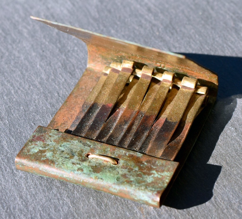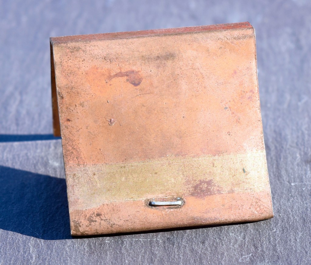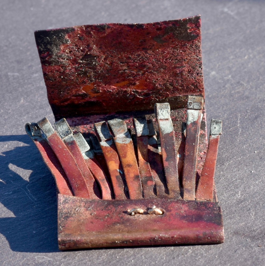 I make “matchbooks” from silver, copper, and brass. They are then variously colored and textured by chemical patination, polish, or heat treatment. The matchbooks are the same size as a standard flip matchbook. Each one is handmade, unique, and 100% non-flammable. Please contact me if you have any questions.